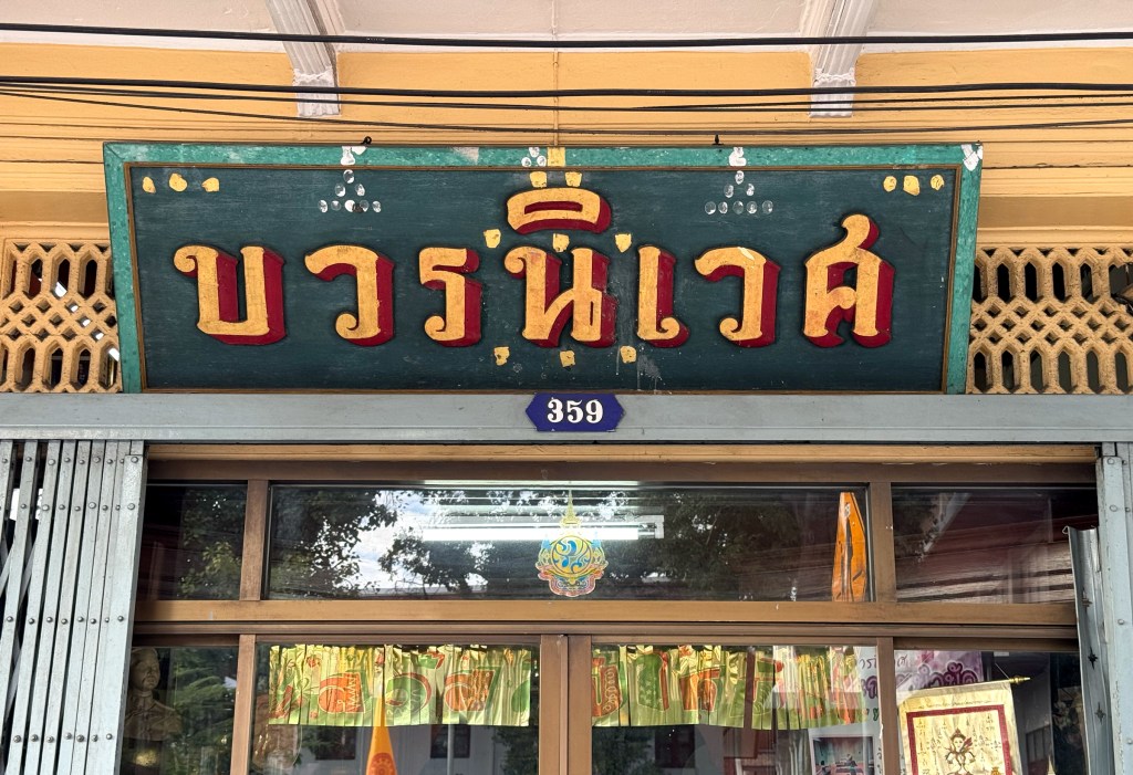 I honestly have no idea what this shop does, it’s located on Khao San Road, right across from the stunning Wat Bowonniwetwiharn Ratchaworawiharn (what a name!). What really stood out to me, though, is the signboard: hand-painted Thai script in gold and red on a dark green wooden background. It’s beautifully vintage and full of character.