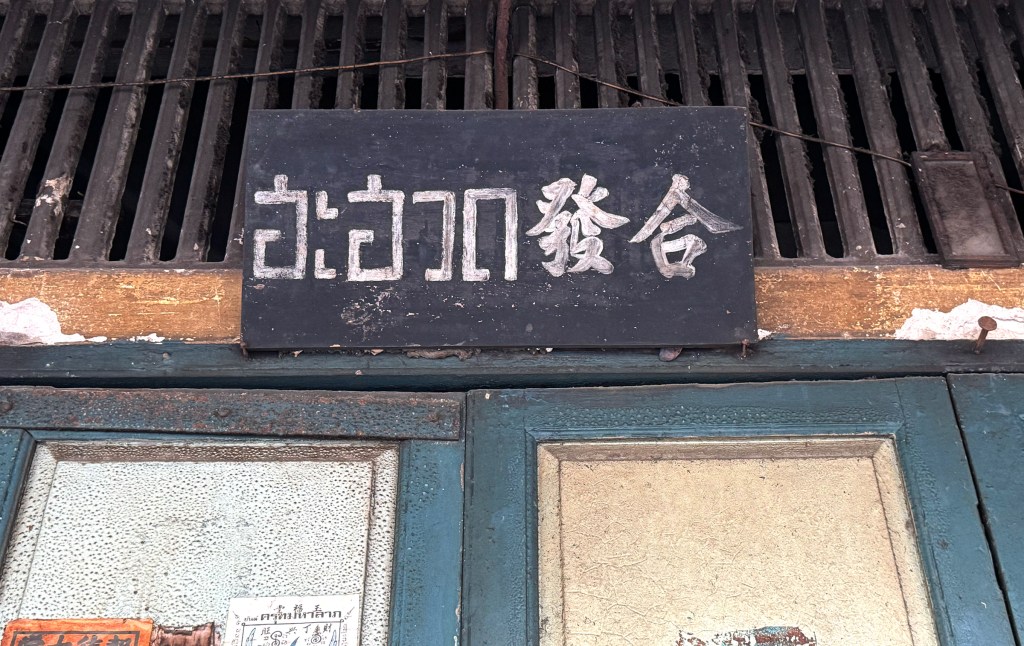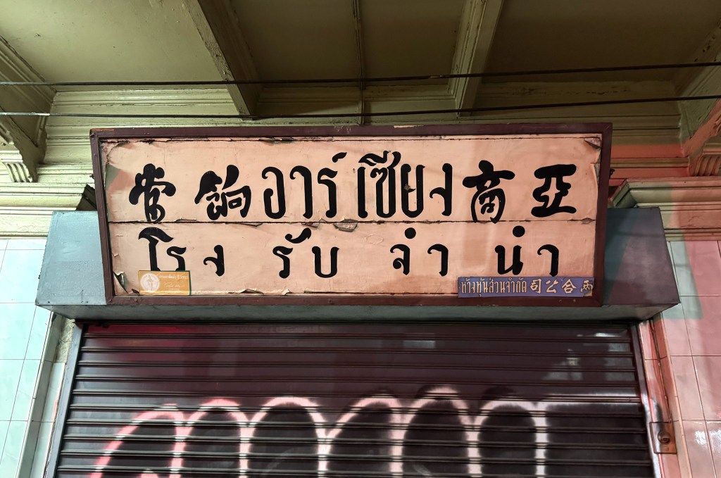 This sign belongs to a pawn shop, an old one, from the look of it. I can’t read Thai, but the Chinese name beside it caught my eye. The calligraphy style is so unique; it reads “Asian Business Pawn Shop.” What’s fascinating is how the Chinese characters blend seamlessly with the Thai script.