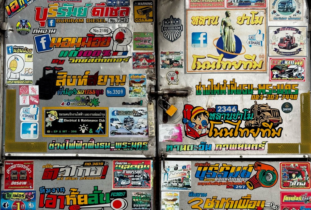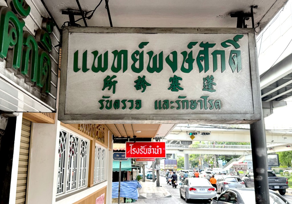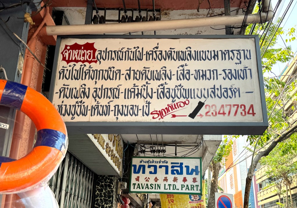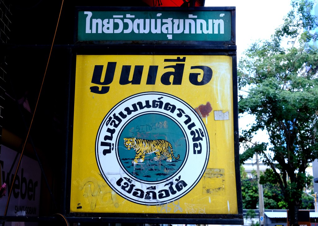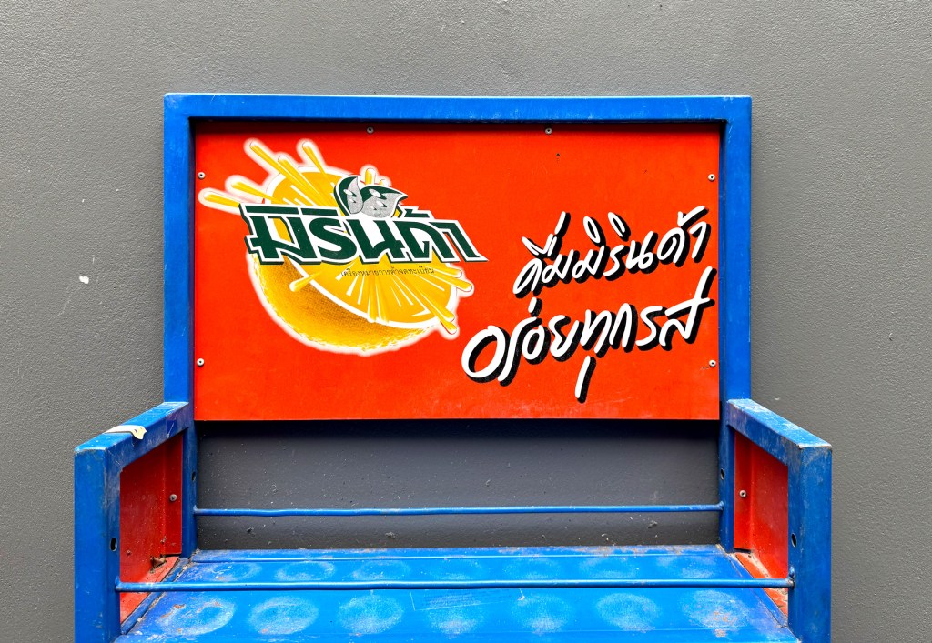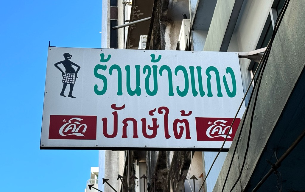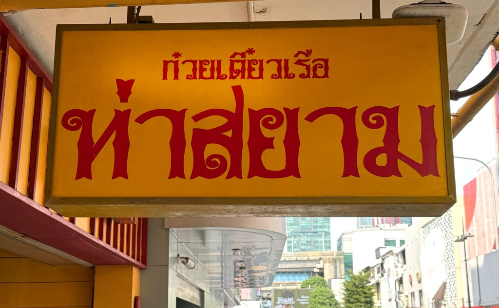 This restaurant features two sets of signage — one being a lightbox. The main sign is straightforward: big blue Thai script with the red Chinese restaurant name mounted on tiled walls. But the lightbox is more interesting — the Thai script feels like it’s been styled to match the look of the Chinese font, creating a surprisingly cohesive design.