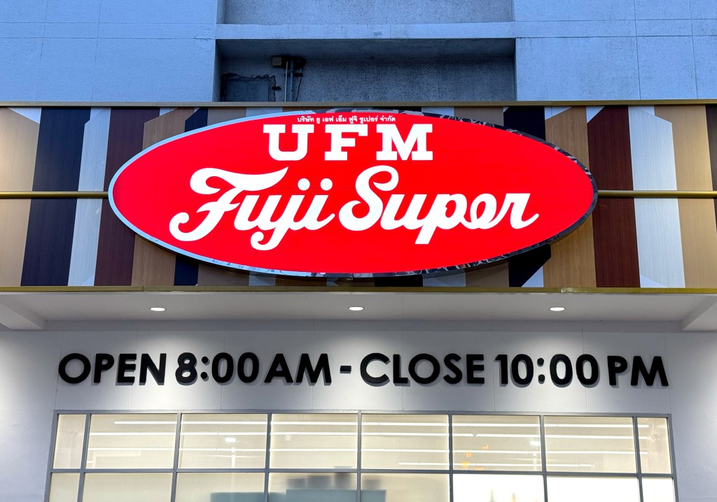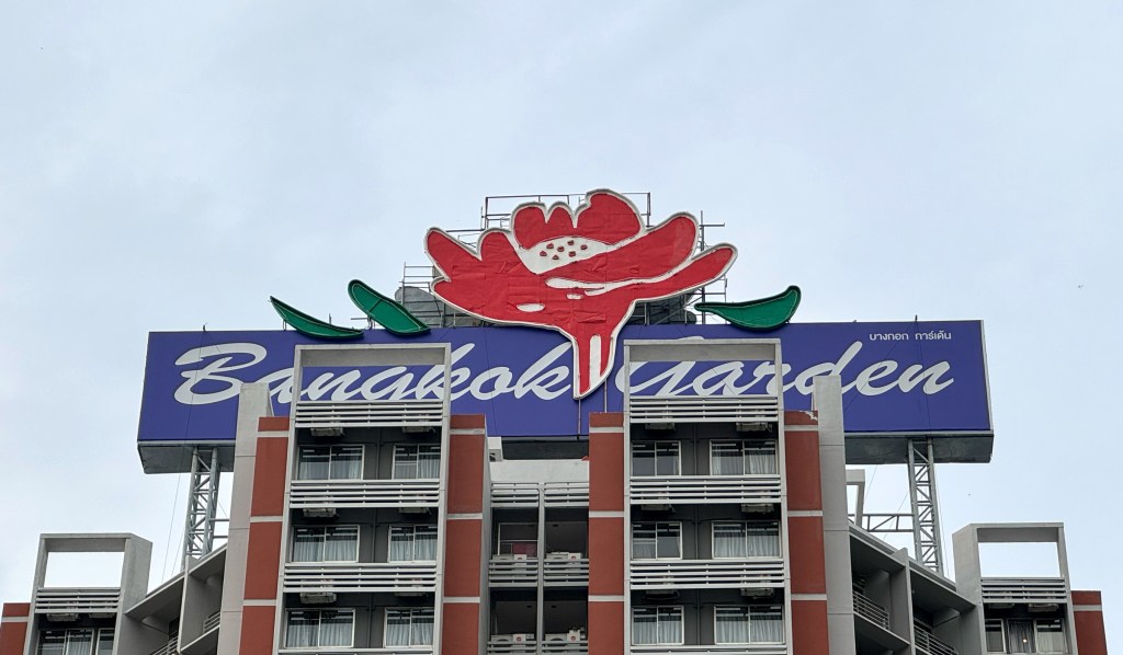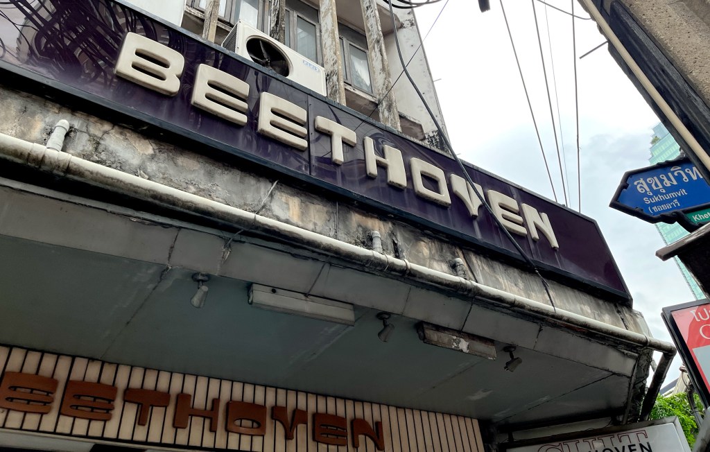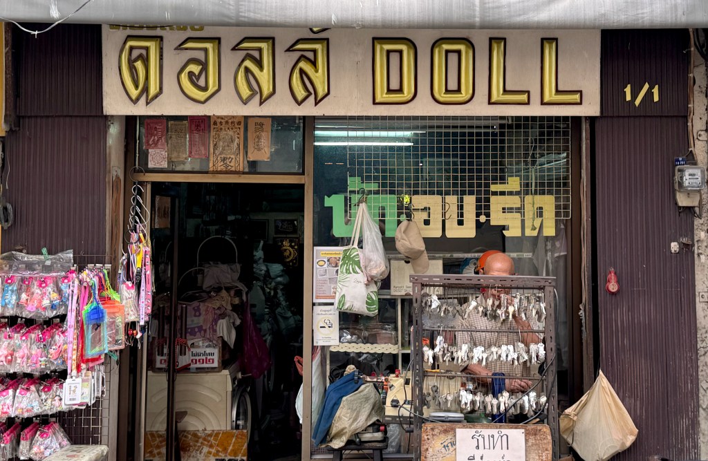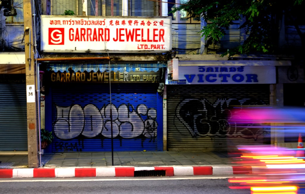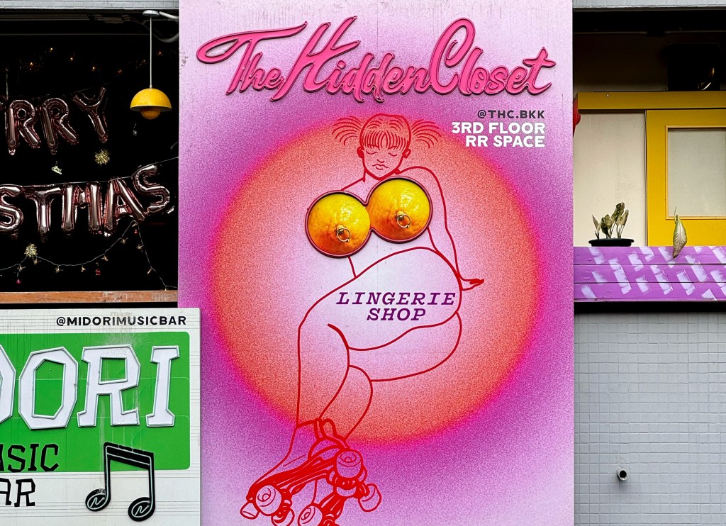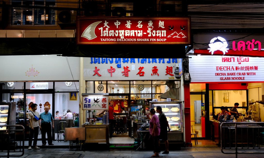 This restaurant features two sets of signage — one being a lightbox. The main sign is straightforward: big blue Thai script with the red Chinese restaurant name mounted on tiled walls. But the lightbox is more interesting — the Thai script feels like it’s been styled to match the look of the Chinese font, creating a surprisingly cohesive design.